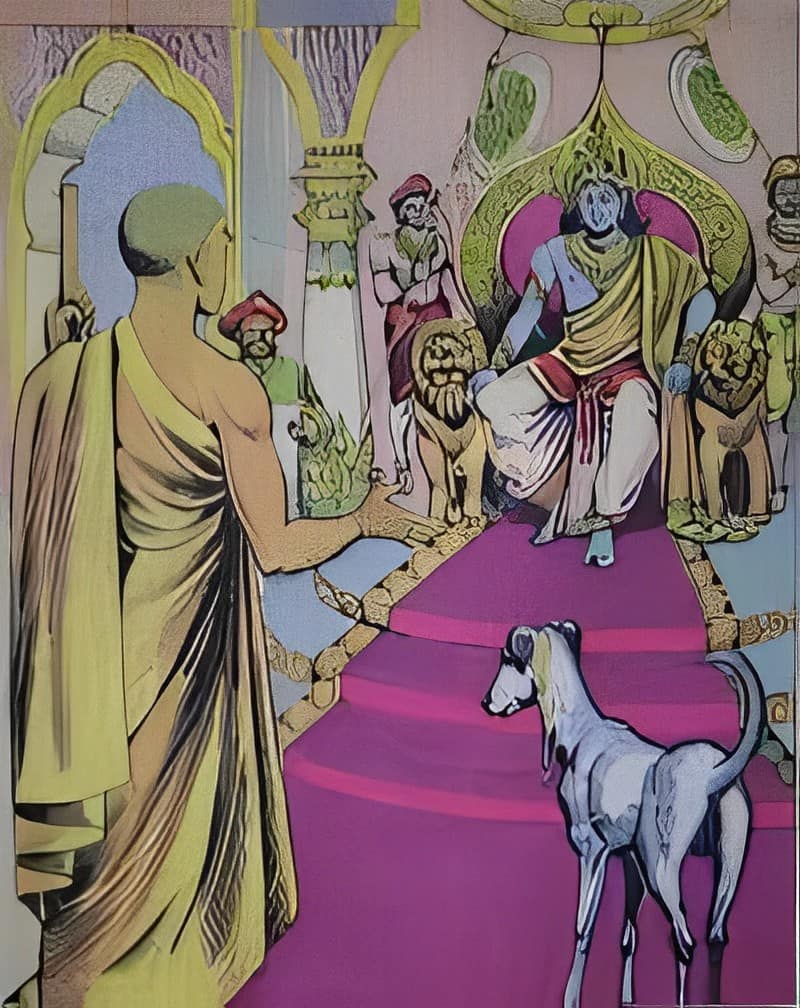 One day, a dog made a surprising appearance in the court, seeking justice. The dog recounted how it had been eating food on the street when it was suddenly assaulted by a saint wielding a stick, causing it great pain. Seeking justice, the dog had come to Sri Ram’s court to make its case.